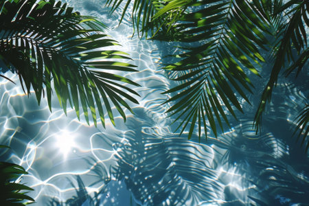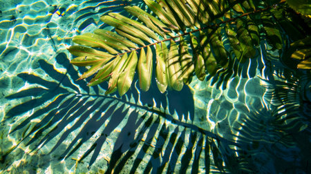 Palm leaves gently arch over turquoise water, showing the vibrant interplay of light and shadows beneath the surface, capturing a tranquil and serene atmosphere in a tropical paradise.