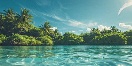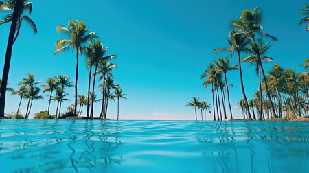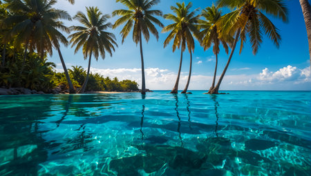 Experience the tranquility of a tropical paradise with crystal clear waters, vibrant palm trees, and a stunning blue sky, perfect for vacation and relaxation.