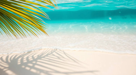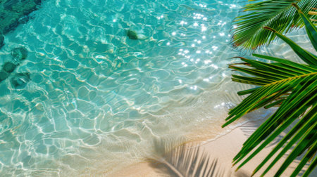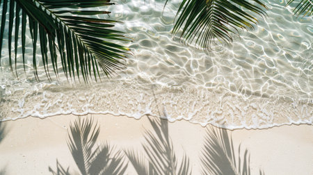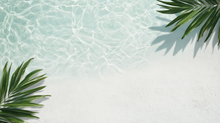 Tropical background featuring palm leaves on white sand meeting a clear water surface, creating a serene and relaxing summer atmosphere, perfect for travel and leisure projects