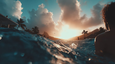 A persons silhouette is seen from a low angle in the ocean waves, watching the sun set behind a tropical island with palm trees and dramatic clouds.