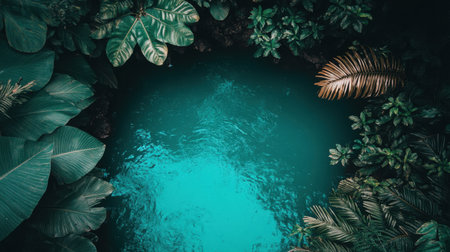 Vibrant tropical leaves create a stunning frame around a turquoise water background, capturing the essence of relaxation and vacation bliss.