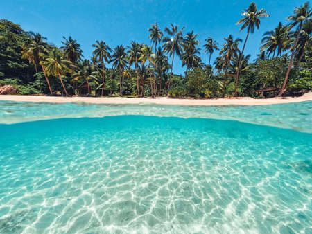 Split underwater photo of tropical island with palm trees, sand and sea