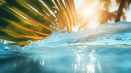 Tropical palm leaves and splashing water with sunlight effect.