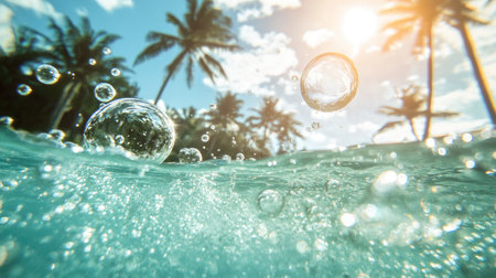 Experience a serene tropical scene with clear water and floating bubbles, framed by lush palm trees under a bright sky, perfect for relaxation.