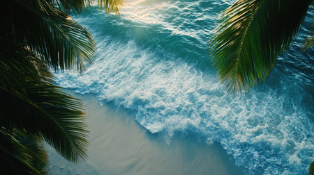 This stunning image captures the beauty of turquoise water lapping against a sandy beach, framed by lush tropical palm leaves under bright sunshine.