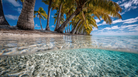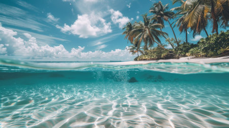 Over under (split-level) view captures the edge of a sandy tropical beach lined with tall palm trees reaching towards a bright blue sky dotted with white clouds, while the clear turquoise ocean water reveals the light colored, pebbled or coralline seabed below the surface.