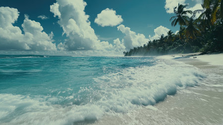 Bright tropical waters with soft waves rolling gently to shore near palm-fringed coast