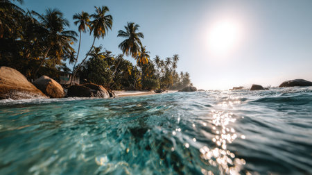 A stunning tropical beach scene featuring clear water, swaying palm trees, and a bright sun overhead. This serene landscape captures the essence of paradise and relaxation.