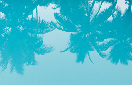 Palm tree leaves cast a shadow on the surface of a turquoise pool. The water ripples slightly, creating a beautiful and relaxing scene.