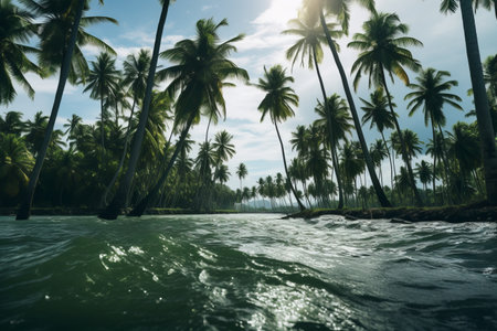 Tropical Paradise: Tranquil Waterside Oasis with Lush Green Coconut Trees