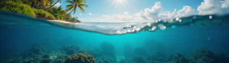 Underwater view of tropical island with palm trees and turquoise water