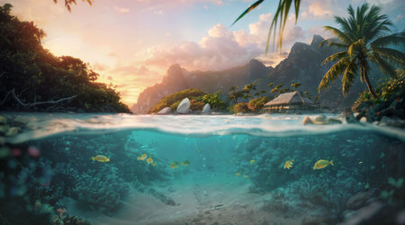 panorama of a beach resort and underwater world at the same time, dividing the image into upper and lower parts by a wave