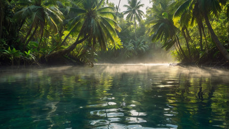 Vibrant green foliage and palm leaves create a natural frame around a tranquil river flowing through a lush tropical jungle, showcasing the beauty and serenity of nature