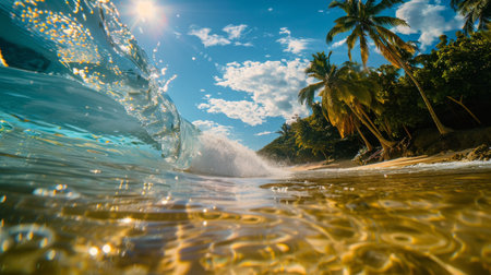 Stunning underwater beach view with palm trees, clear water, and sunlight.
