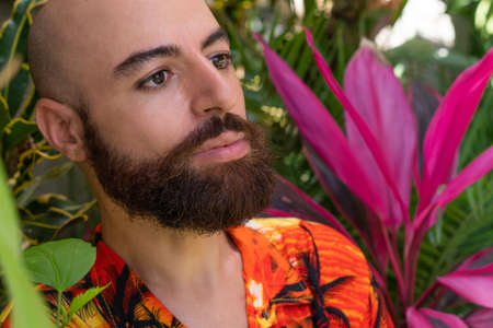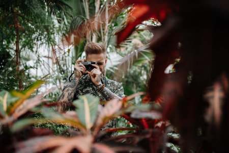 Handsome man with tattoos standing in botanical garden, in the middle of lush green foliage, holding camera and taking photography.