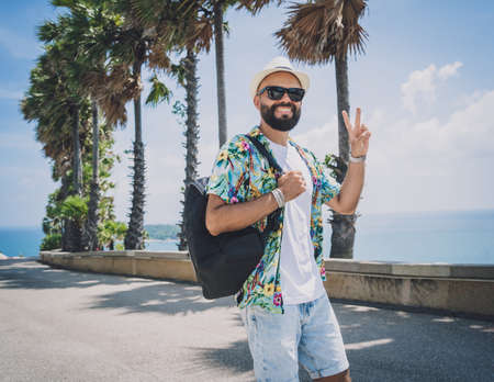 Young traveler man at summer holiday vacation with beautiful palms and seascapes at background