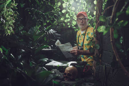Funny scared tourist lost in the tropical jungle, he is holding a map