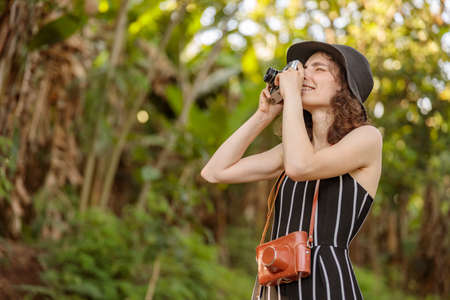 Lifestyle portrait of young photographer with vintage camera taking photo.