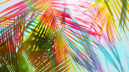 Dynamic closeup of tropical palm leaves with vivid red, yellow, and blue lighting. Nature meets art in an exotic spectacle, showcasing vibrant colors and lush foliage