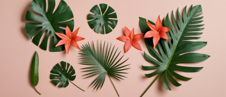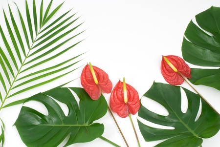 A flatlay image showcasing a frame of vibrant green tropical leaves and red orange flowers against a white backdrop.
