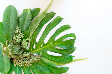 Tropical top view summer botanical concept still life white frame with monstera liana, vine, palm leaves and plumeria frangipani flower flat lay layout