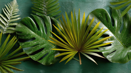 A captivating arrangement of green tropical leaves against a textured wall, showcasing diverse shapes and vibrant colors, ideal for nature-inspired themes.