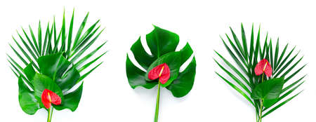 Flat lay composition with tropical leaves and hibiscus flowers on white background