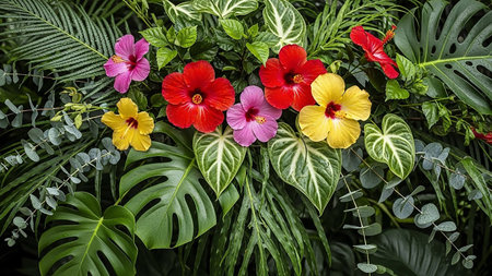 A close-up arrangement of vibrant tropical flowers, including red, yellow, and pink hibiscus, interspersed with lush green leaves and foliage. The diverse textures and shapes of the plants create a rich, natural pattern. The overall impression is one of exotic beauty and abundant plant life.