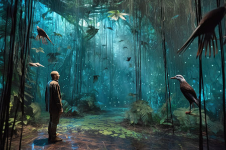 person, walking through virtual rainforest, with the sound of dripping water and birds singing, created with generative ai