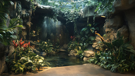 A zoo exhibit dedicated to rainforest species, featuring birds of paradise, jaguars, and exotic reptiles with lush greenery