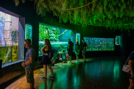 Antalya, Turkey - September 26, 2022: People enjoy the underwater view of the aquarium with longest in the world panoramic tunnel, Antalya, Turkey.