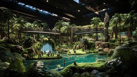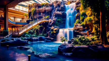 Indoor water park. Amusement park. Tropical-themed water park. Palm trees, rivers, tube water slides, swimming pools. Spa features, flowing streams and tranquil attractions. Summer holidays destination. Summer fun. Hotel and luxury resort
