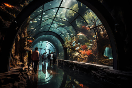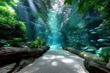Underwater tunnel in a large aquarium with fish swimming and light beams