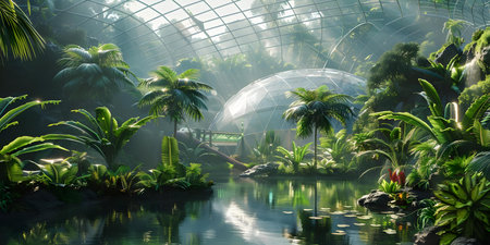 Visual representation of a biodome in a tropical environment highlighting sustainable farming and clean energy. Concept Sustainable Biodome, Tropical Environment, Clean Energy, Sustainable Farming