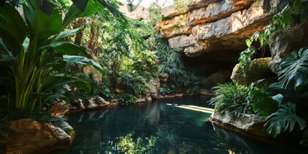 A serene canyon oasis with lush green plants, a clear pool reflecting the surrounding rock walls, and soft sunlight streaming through the opening above. The tranquil setting feels like a hidden paradise.