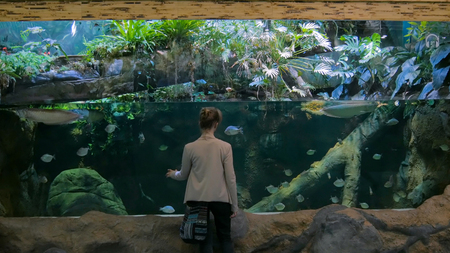 Woman stay near big aquarium tank, watching the fish. Tourism and entertaiment concept