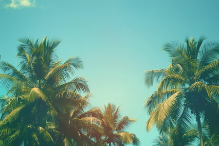 Palm trees against blue sky Palm tree at tropical coast vintage toned and stylized coconut tree