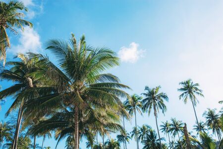 Tropical palm tree with blue sky and cloud abstract background. Summer vacation and nature travel adventure concept. Pastel tone filter effect color style.
