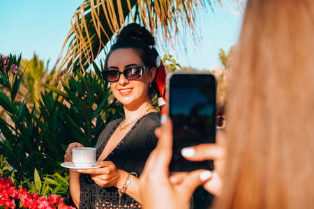 Happy girlfriends taking photo on vacation Concept of friendship and fun in the summer technology Best friends enjoying moments with modern smartphone. Traveling bloggers. Social media