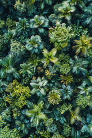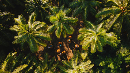 Aerial view of coconut palm trees in the tropics. Top view