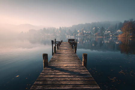 A wooden dock stretches out over a tranquil lake, disappearing into a misty atmosphere. The image showcases warm autumn colors contrasting with cool tones. The composition features a natural outdoor setting, suggesting various uses for travel or scenic illustrations. The scene evokes a sense of peace and contemplation.