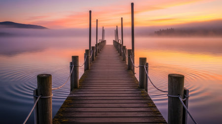 Tranquil misty lake at sunrise with wooden pier leading towards the foggy horizon
