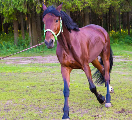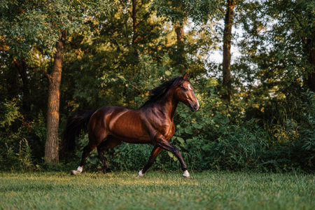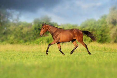 Beautiful bay stallion running on green meadow in sunny day