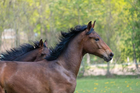 A head of stallion horses, at a sunny day. Galloping dressage horse stallions in a meadow. Breeding horses