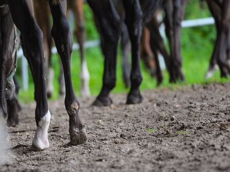 Herd of young horses in paddock, view on hooves. Hooves of colts and fillies in paddock in summer. Foals at the ranch