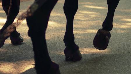 Horses feet and horse-drawn wagon detail