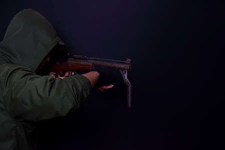 Robber assassin crime with hood points the gun already shoot