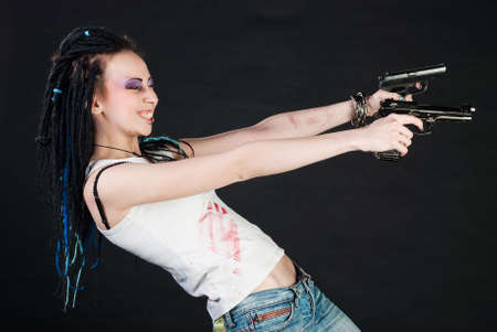 white girl shoot handgun with two hands on black background