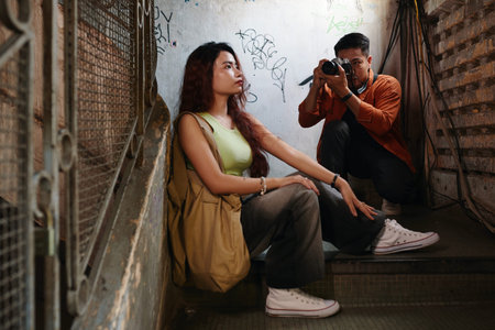 Young woman posing for photographer on steps of old building