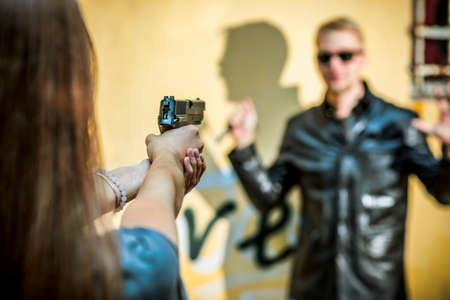 girl with a gun holds on the sight of the criminal with a knife in his hand. The thug wants to attack a woman